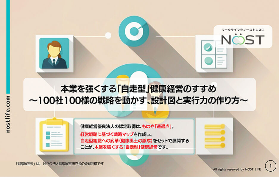 健康経営に取り組むお客様企業を支援したいNOSTの信念と、NOSTのサービスの概要を紹介する資料です。健康経営の課題と本質を理解する読み物としてもお役に立ちます。