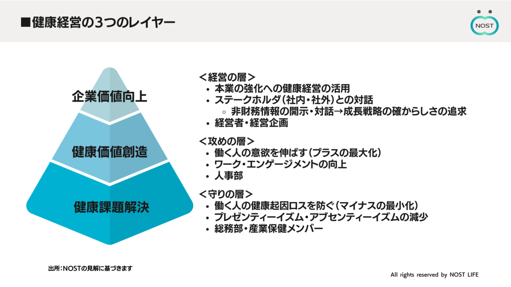 私たちNOSTでは、健康経営を以下の3つのレイヤーで整理しています。