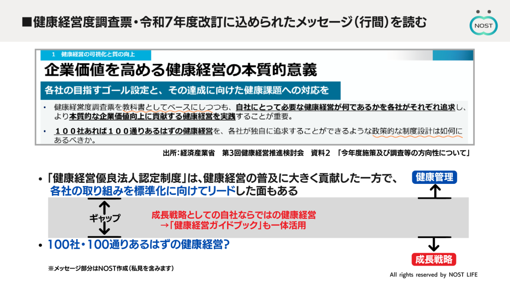 実は、国(健康経営優良法人認定制度を推進する経済産業省)自身もこの状況を「本来の方向ではない」と反省しています。